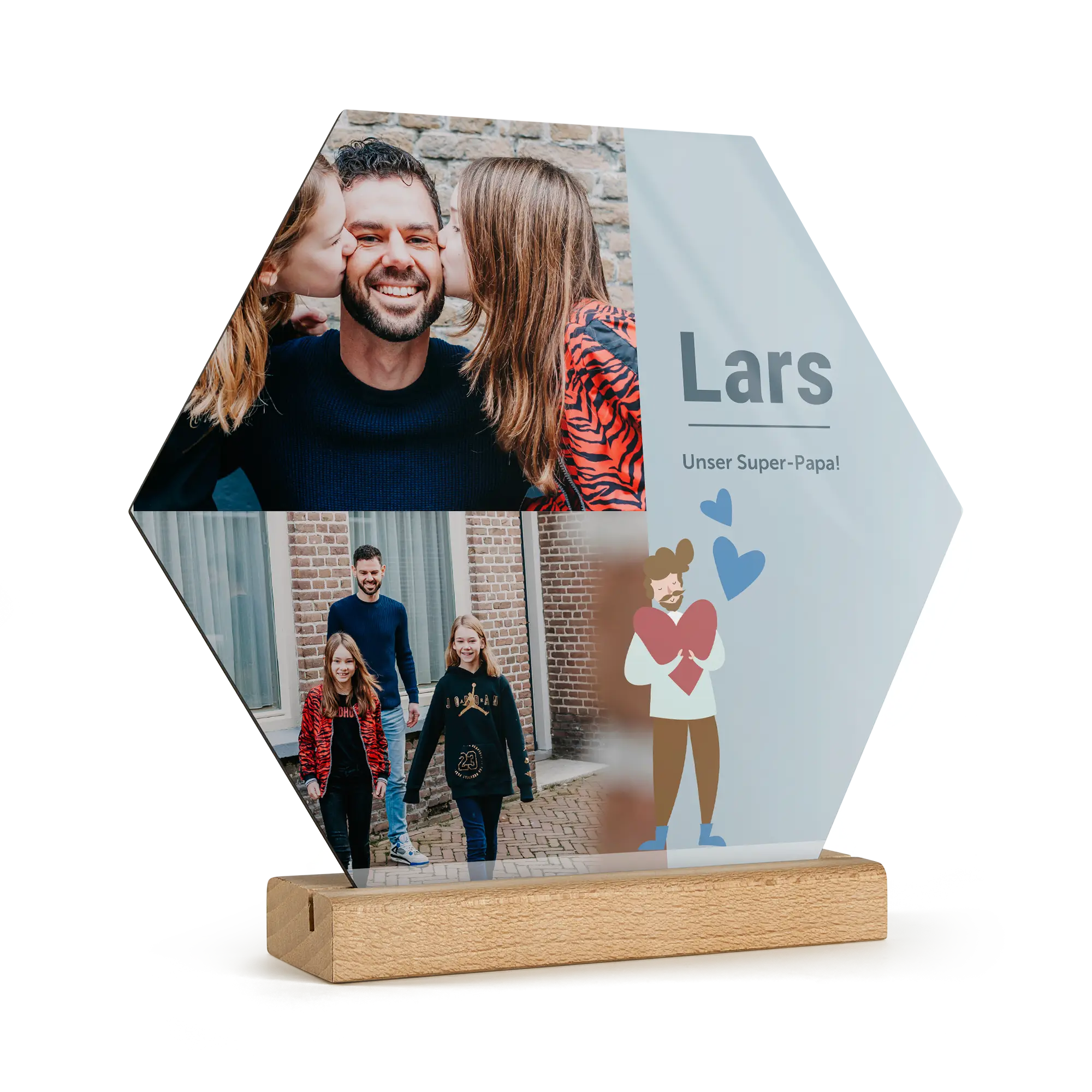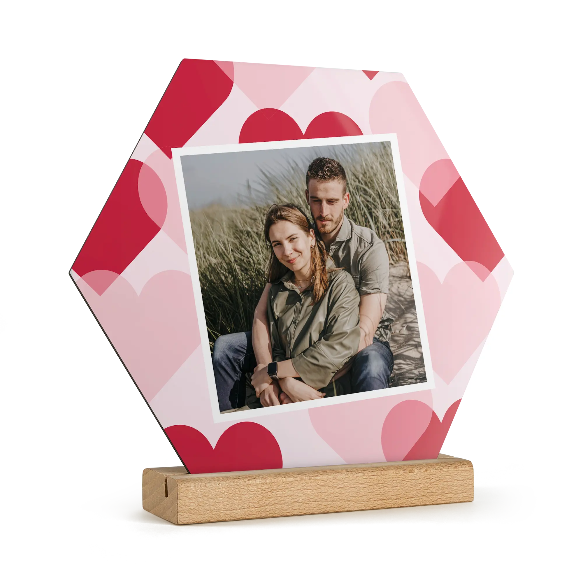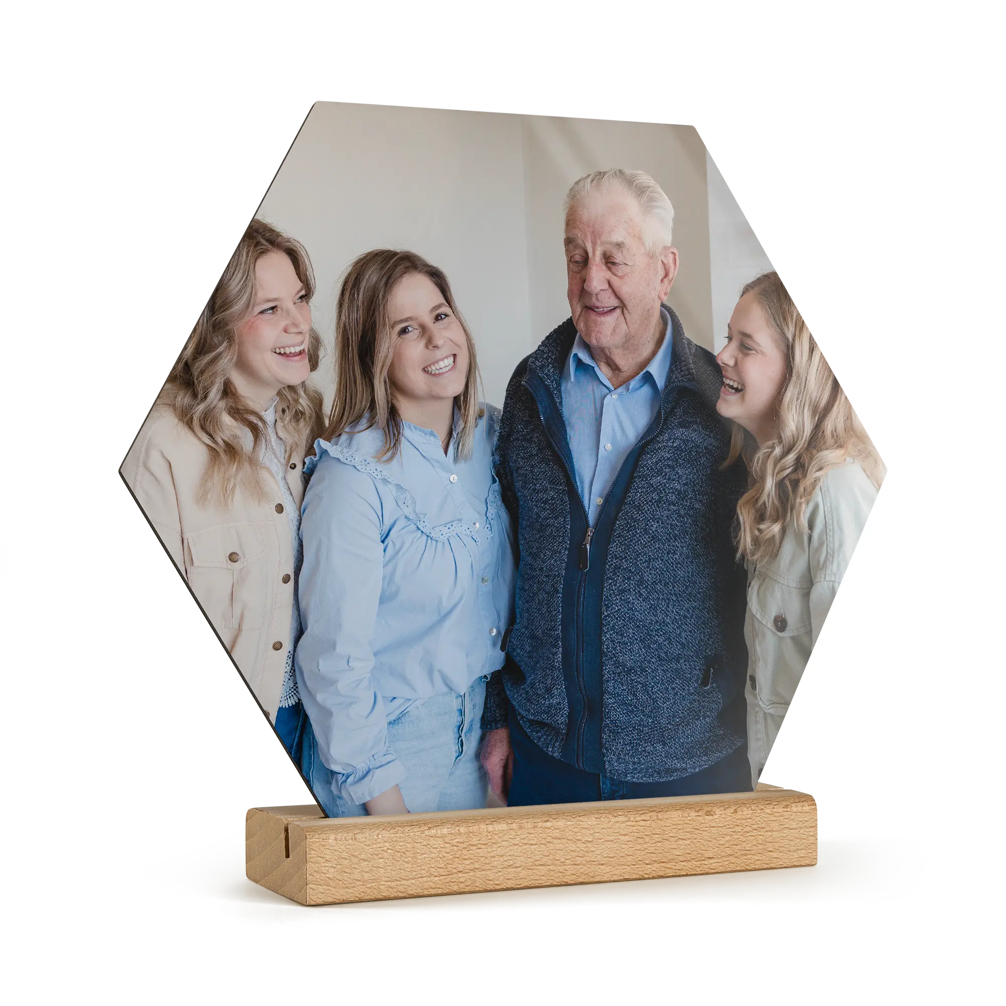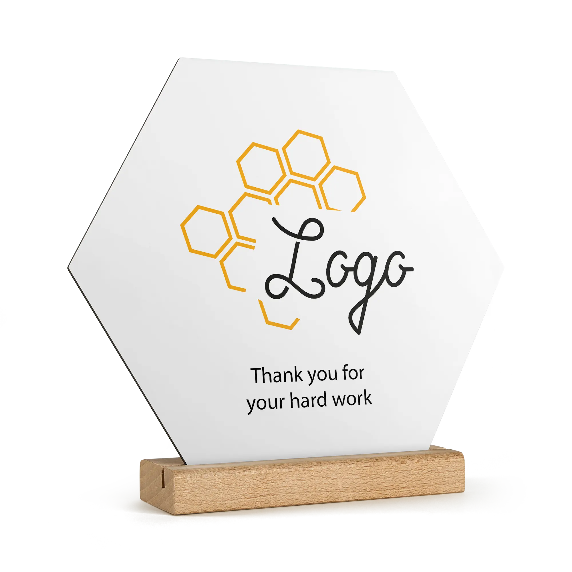 Mais informações sobre o painel de madeira:Forma: hexágonoMaterial: Madeira compensada de alta qualidadeAcabamento: Revestimento brilhanteDimensões do painel: 23 x 20 x 20 x 0,3 cmDimensões do suporte: 15 x 5 x 2 x 2 cmPersonalização: com foto, texto e/ou logoImpressão: em cores claras e nítidas