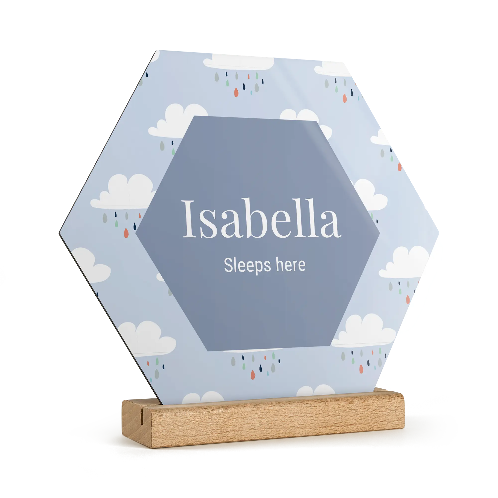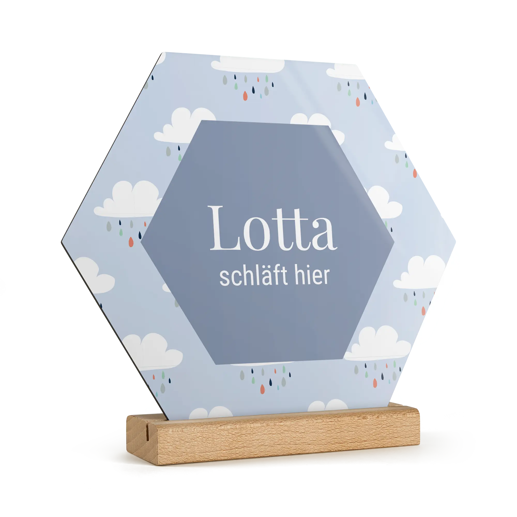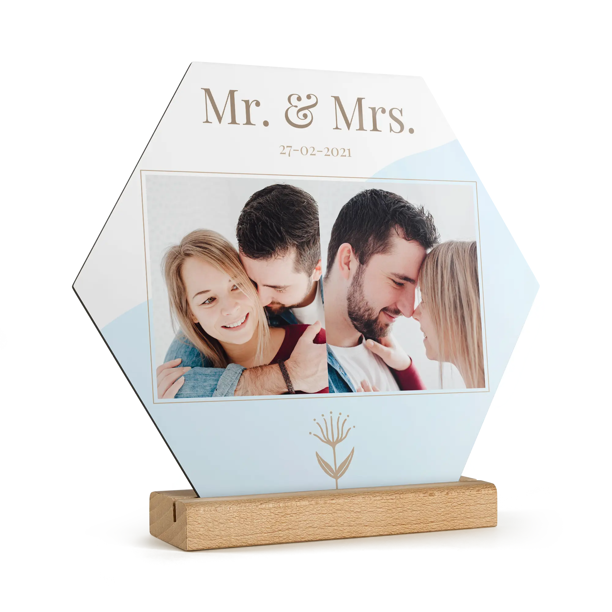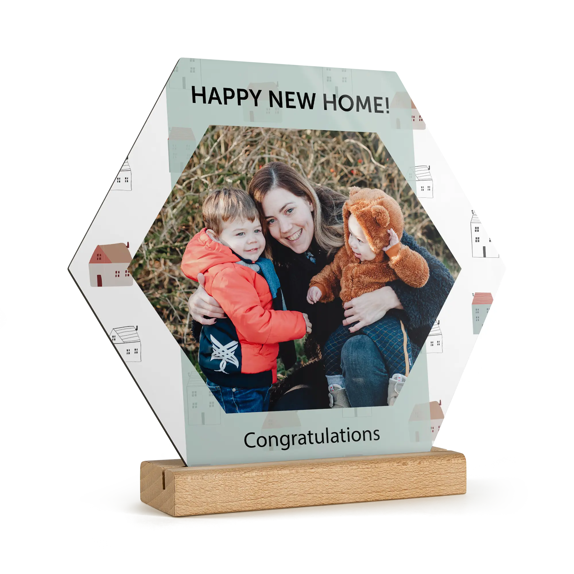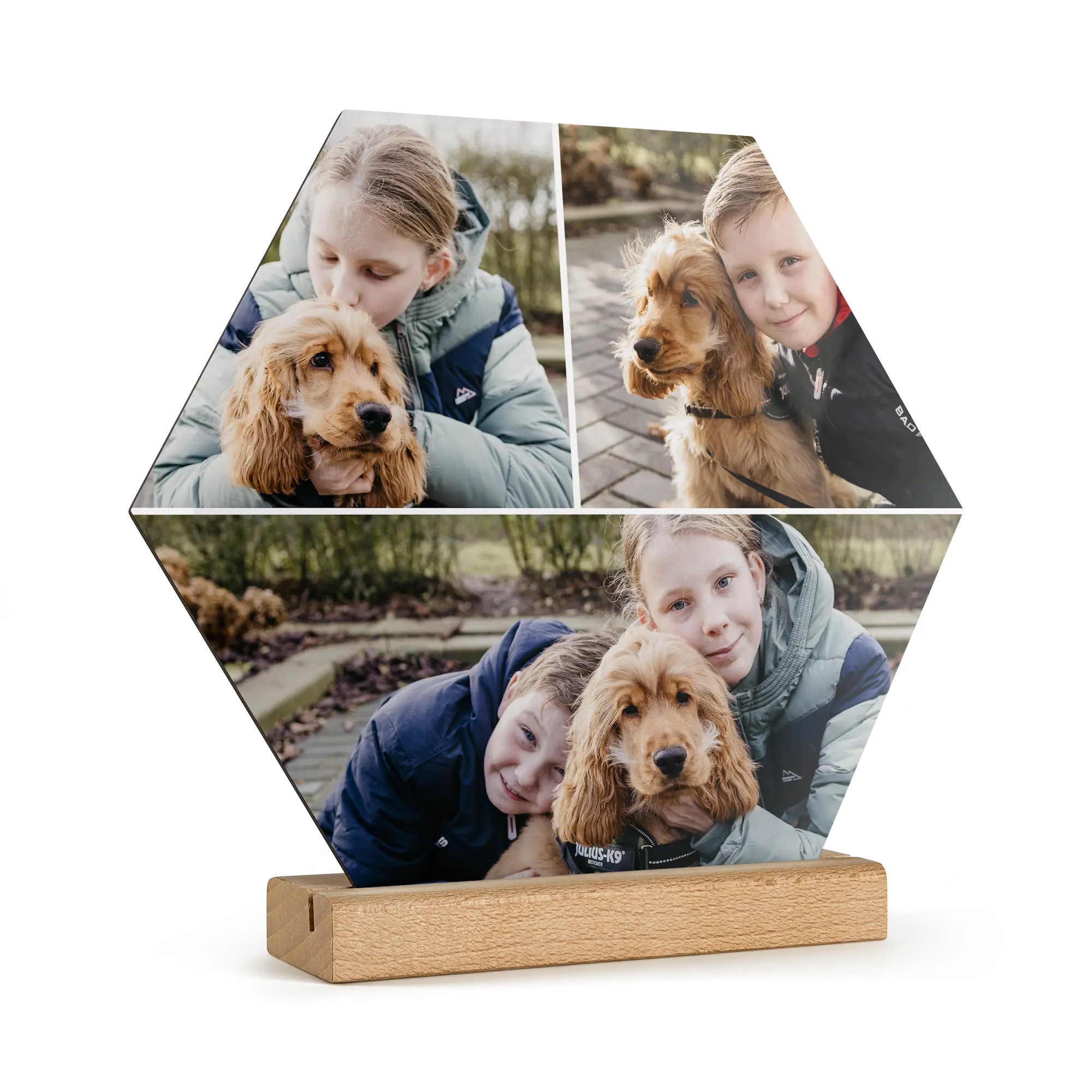 Mais informações sobre o painel de madeira:Forma: hexágonoMaterial: Madeira compensada de alta qualidadeAcabamento: Revestimento brilhanteDimensões do painel: 23 x 20 x 20 x 0,3 cmDimensões do suporte: 15 x 5 x 2 x 2 cmPersonalização: com foto, texto e/ou logoImpressão: em cores claras e nítidas