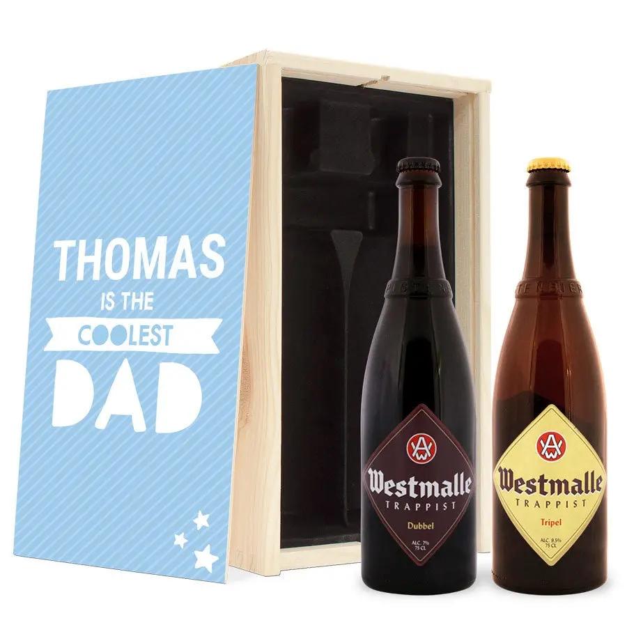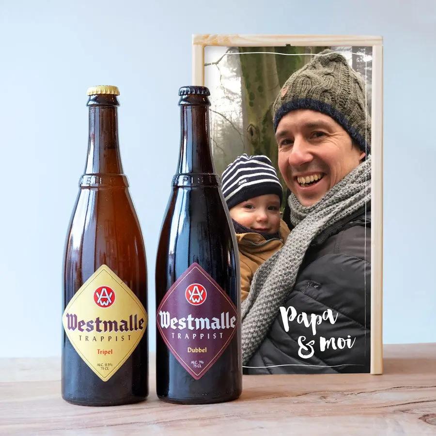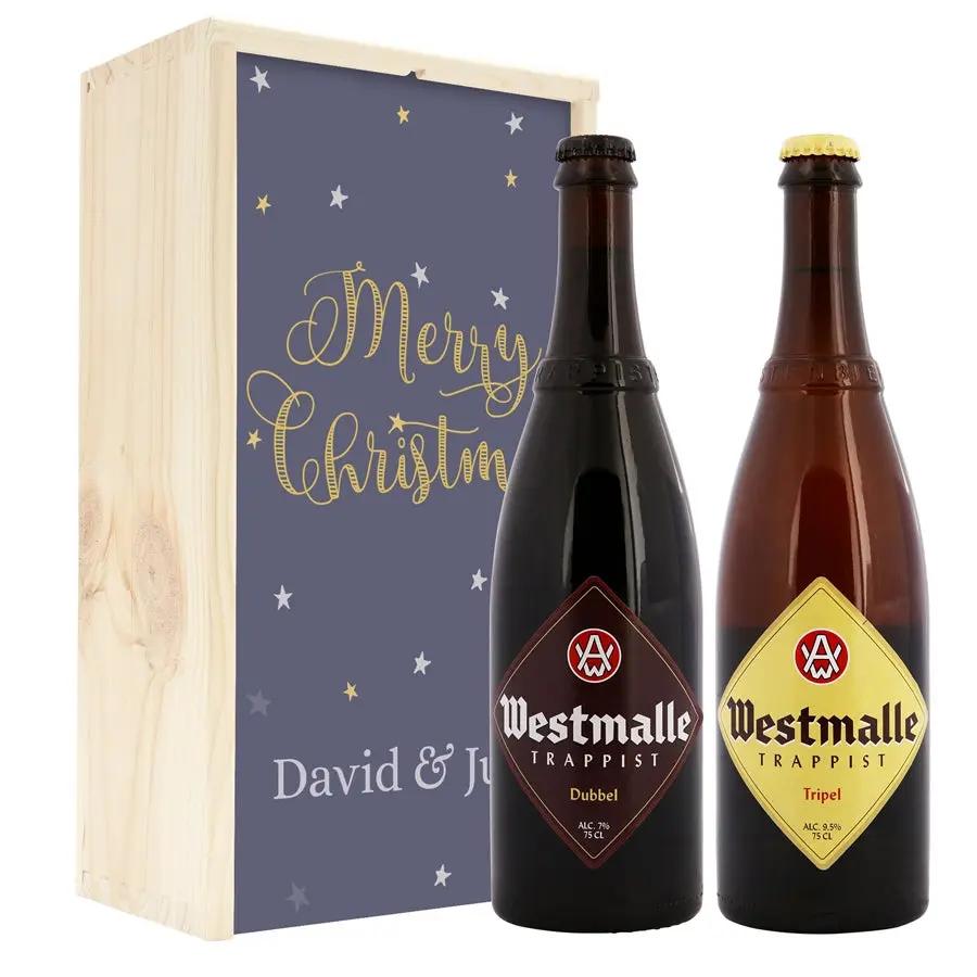 Deliciosas garrafas de cerveja Westmalle Double e Tripel em uma luxuosa caixa de madeira personalizada com a foto, logotipo e/ou texto de sua escolha.