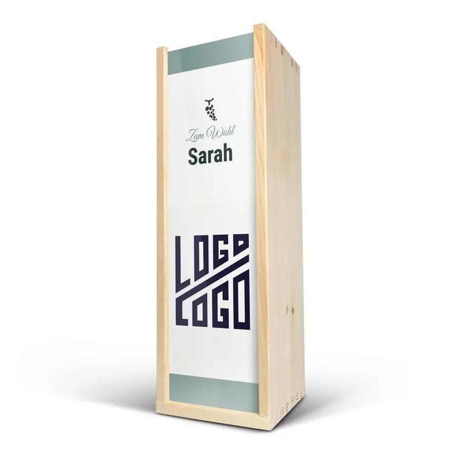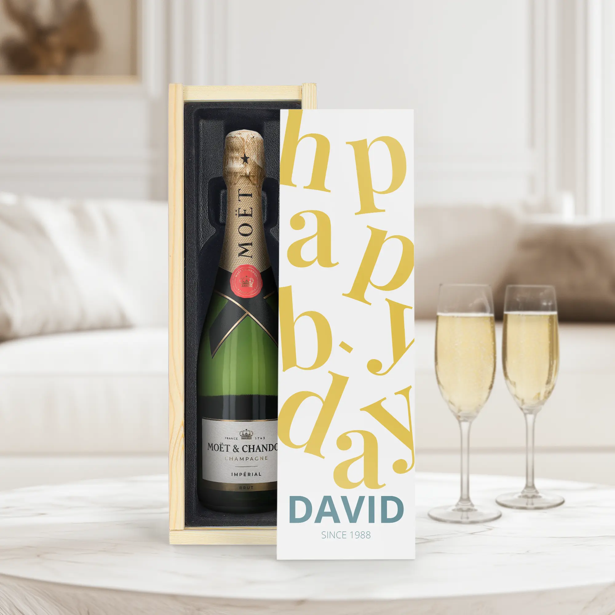 Uma deliciosa garrafa de verdadeiro champanhe Moët & Chandon em uma caixa de madeira gravada com seu nome ou texto. Vários tamanhos de garrafa disponíveis!