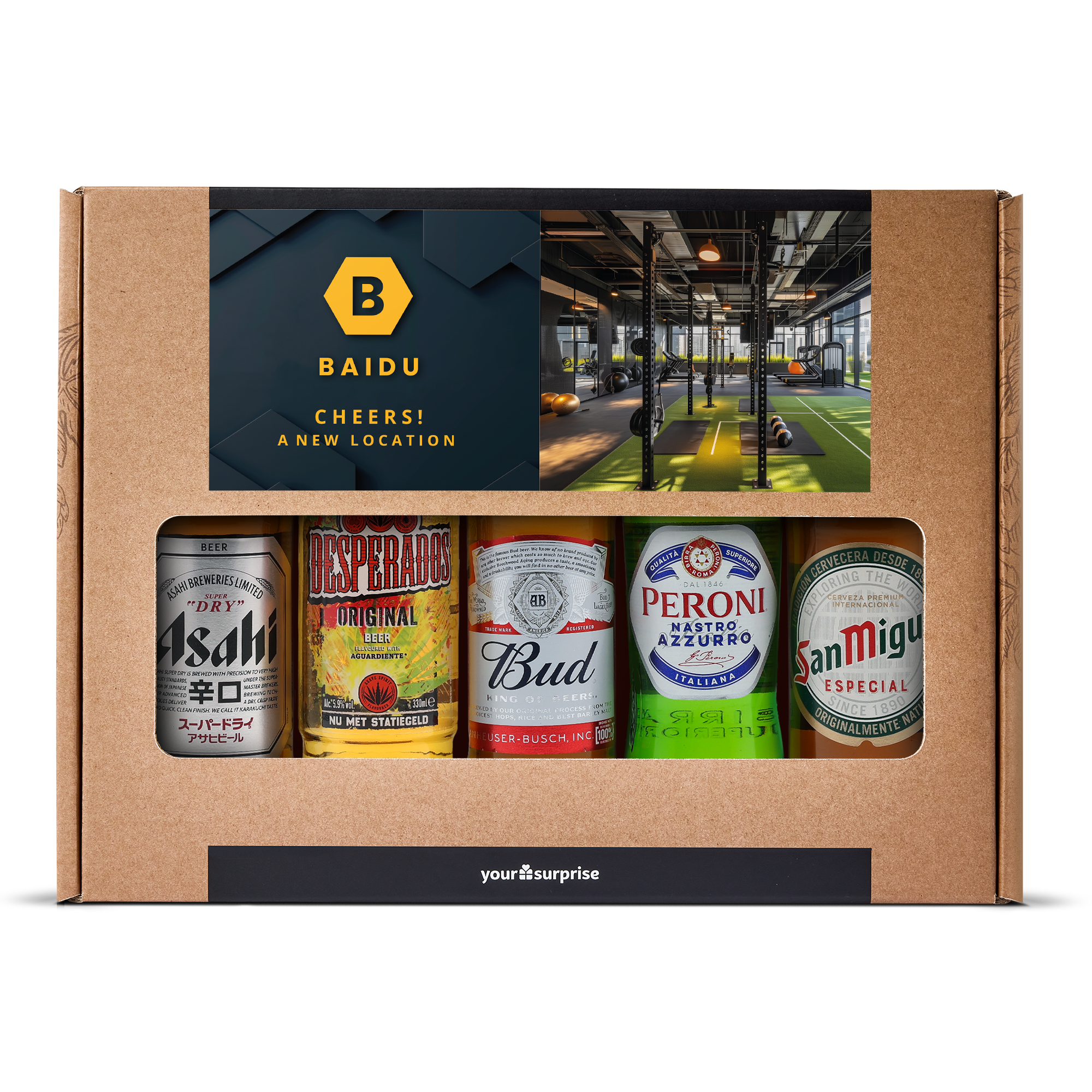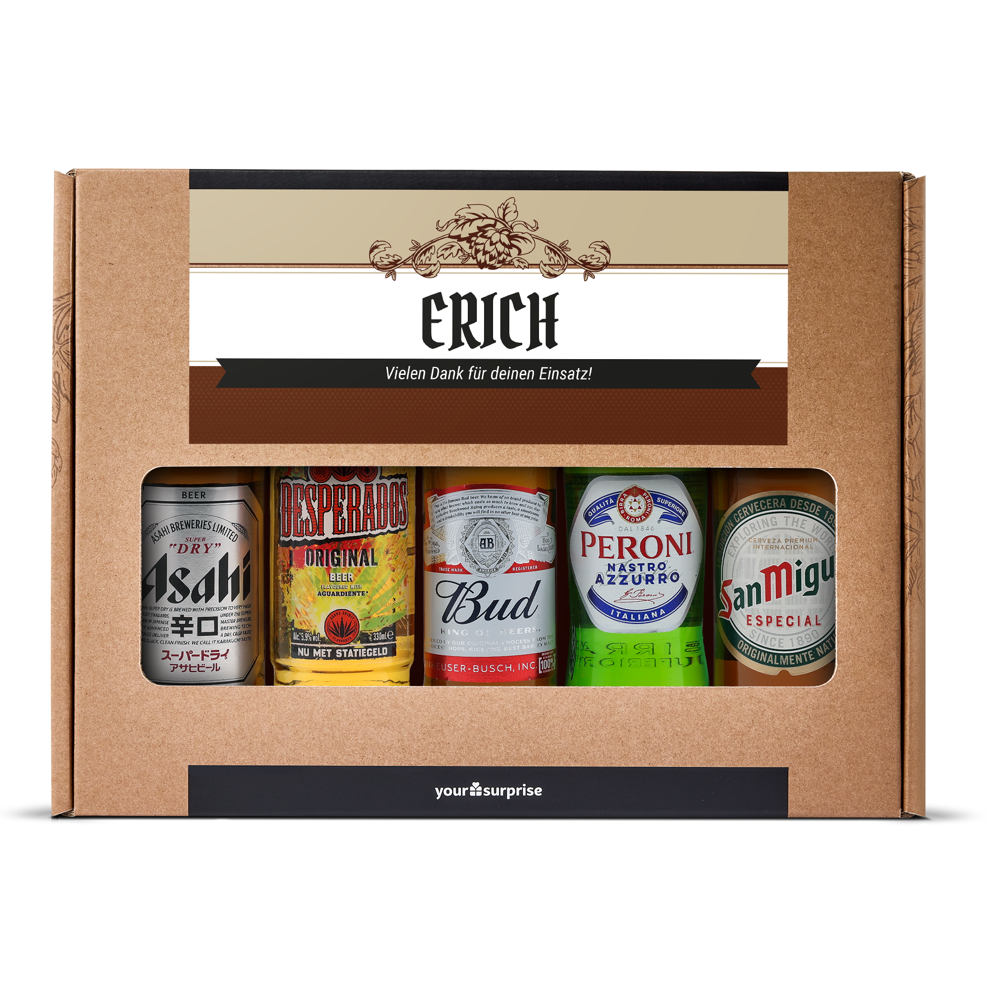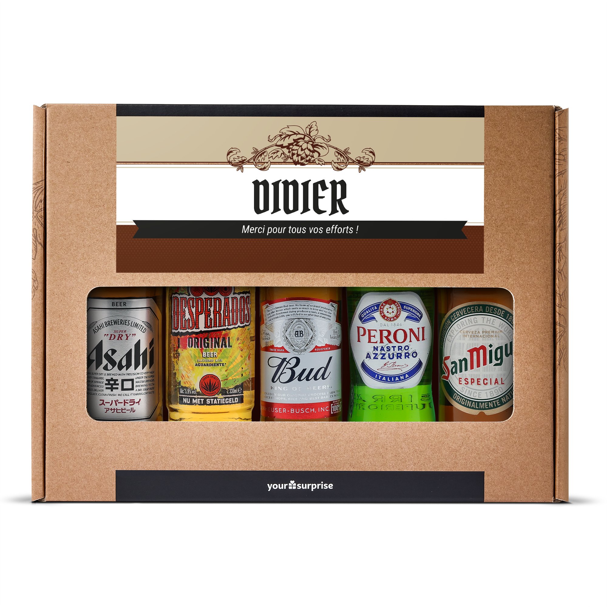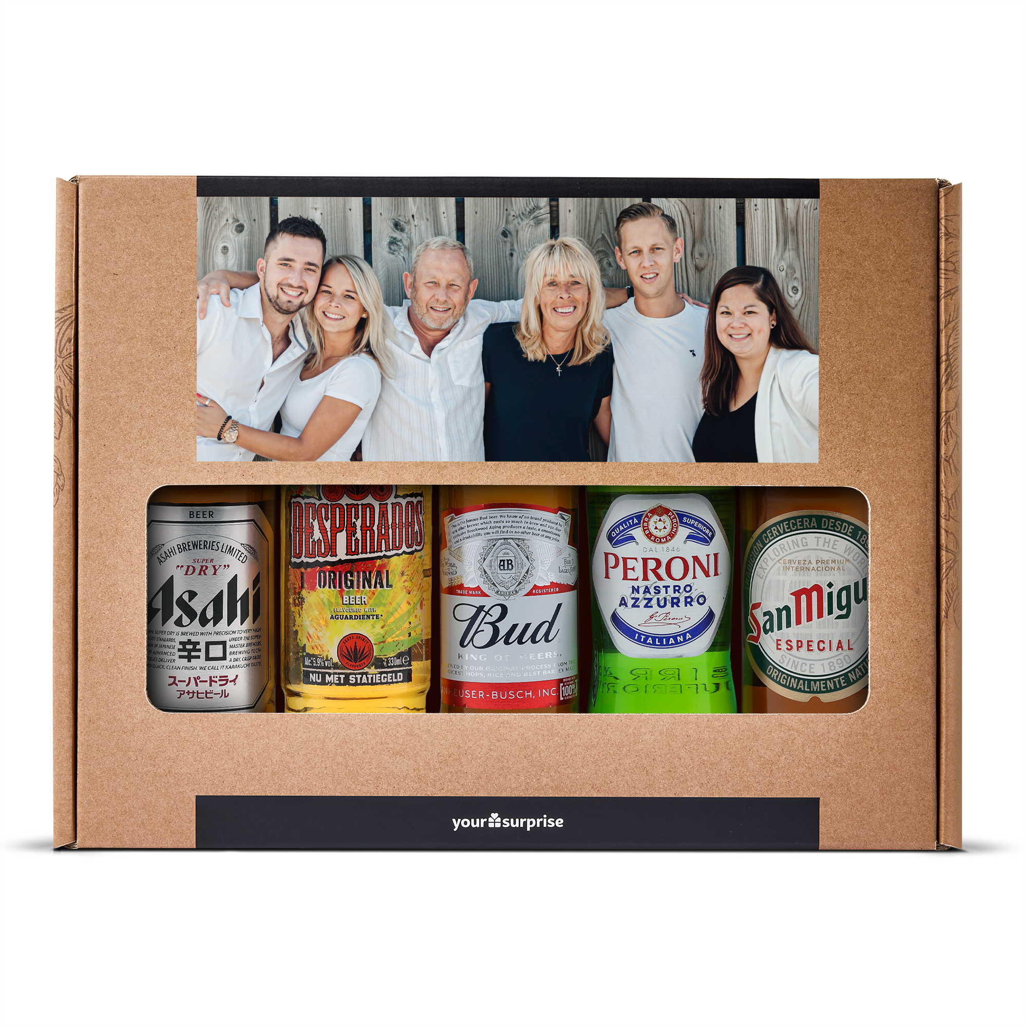 Um presente de cerveja delicioso com sua própria foto e texto, recheado com 5 diferentes cervejas internacionais. Com um design personalizado!